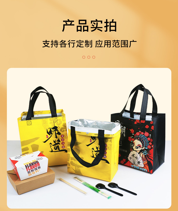 廣告宣傳:無紡布覆膜外賣袋可以作為商家的廣告宣傳工具,客戶可以在袋子上印上自己的品牌LOGO或宣傳語,增加品牌曝光率。